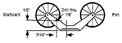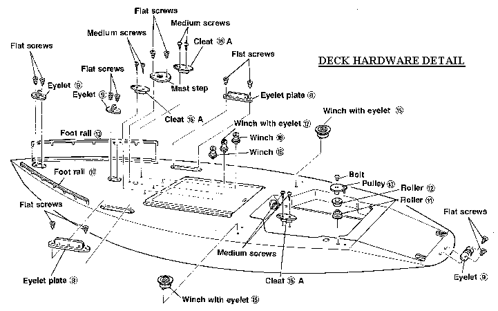 DO NOT use glue to attach the five screw attached "eyelets". Use only the screws. There are two cleats mounted one on either side of the mast step. Drill a 1/8" diameter hole through the side of each cleat between the screws. Install the pulley on the port aft deck using parts 11, 12, and 13. Part 13 has one post. Drill the hole in the steering pedestal, Part 7. Install in the cockpit using CA. NOTE - The pre-formed holes in the cockpit floor for the cleat are not correctly spaced. For an easier installation drill one new screw hole with a 1/32" drill bit.
