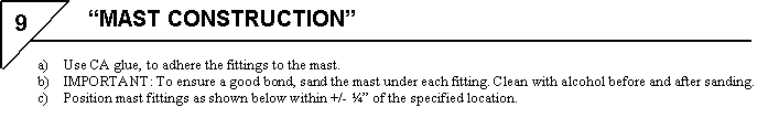 Carefully align them as shown below . Apply a few drops of CA glue to the top and bottom of each fitting at the crack between the mast and fitting.