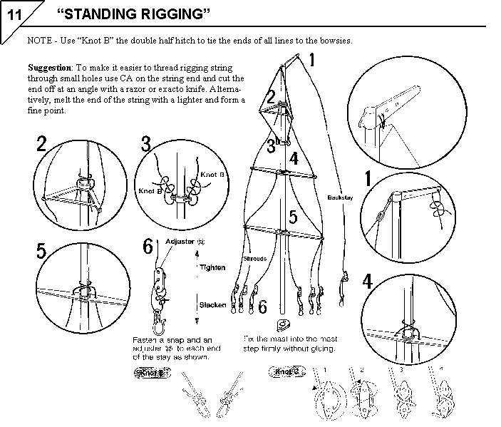 Install the big ends of seven snaps into the Eyeplates and #4 Eyelet. Thread the ends of the shrouds and backstay through the small end of a snap and tie to the bottom hole in the bowsie. See Detail #6 above.