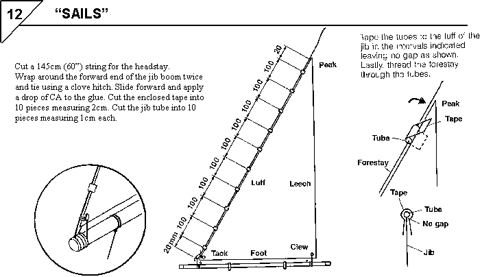 https://www.rcyachts.com/images/build/Rigging/CR-914%20Building%20Assistance.htm Tie the clew of the jib to the black boom ring. Route the jib tack string aft through #1 Eyelet, and fasten it on cleat #2 using Knot C. Pass the headstay through all the jib luff tubes; through the hole in the Jumper, part 22; through two holes of a bowsie; through the forward hole in the Mast Top, Part 20, and then down to the bowsie using Knot B.