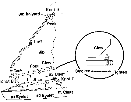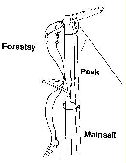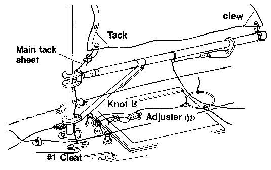 Run the mainsail downhaul string down through the holes in the gooseneck and vang plate, but fasten it on #1 Cleat using Knot C.