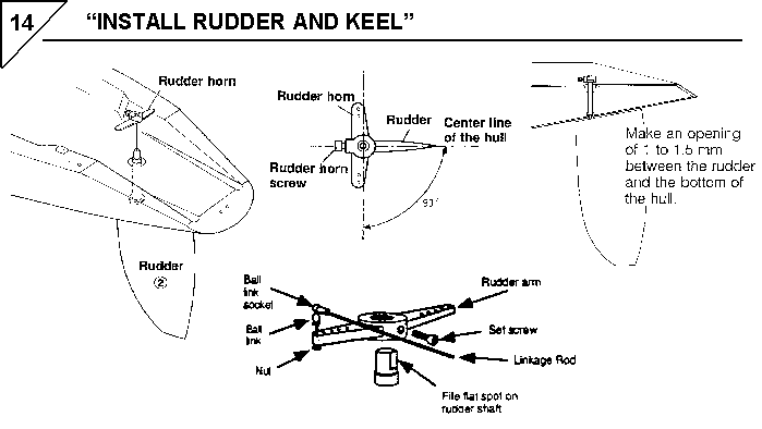 1. Install the rudder and rudder horn. Position the rudder as close to the hull as possible and still let it turn. Tighten the setscrew using the Allen wrench supplied.