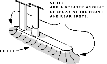 Thoroughly mix the entire contents of the epoxy package. Add the powder thickener until the consistency is like peanut butter. Keel Assembly - Use a generous amount of epoxy in the slot in the ballast for the fin and assemble using the screws. NOTE: The aft keel screw may not "bite-in" to the plastic keel. The front screw and the epoxy will adequately secure the assembly. Check that the axis of the lead ballast is perpendicular to the shaft in the keel fin. Refer to Step 3 graphics. Apply generous dollops of epoxy to the four marked footprints for the Electronics Board. Do not place the mounting board into position yet, wait until step (f). Remove excess epoxy and fill the screw holes on the bottom of the ballast. Reinforce Keel Trunk- Use most of the remaining epoxy to form a generous fillet at the front and back of the keel trunk in the bottom of the boat. Apply some epoxy at the bottom of the compression post and keel shaft pipe. Install the Electronics Board - Carefully lift the board and move it forward to place it in position on the dollops of epoxy. Smooth the epoxy to form fillets at the beam-ends.